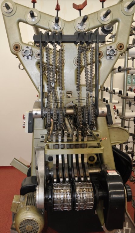 Stroj na výrobu jednolícních osnovních pletenin. Pracovní šířka: 100 cm Dělení: 12E 6 mechanicky ovládaných kladecích lišt vzorovacím řetězem Osnovy podávané z osnovních válů |