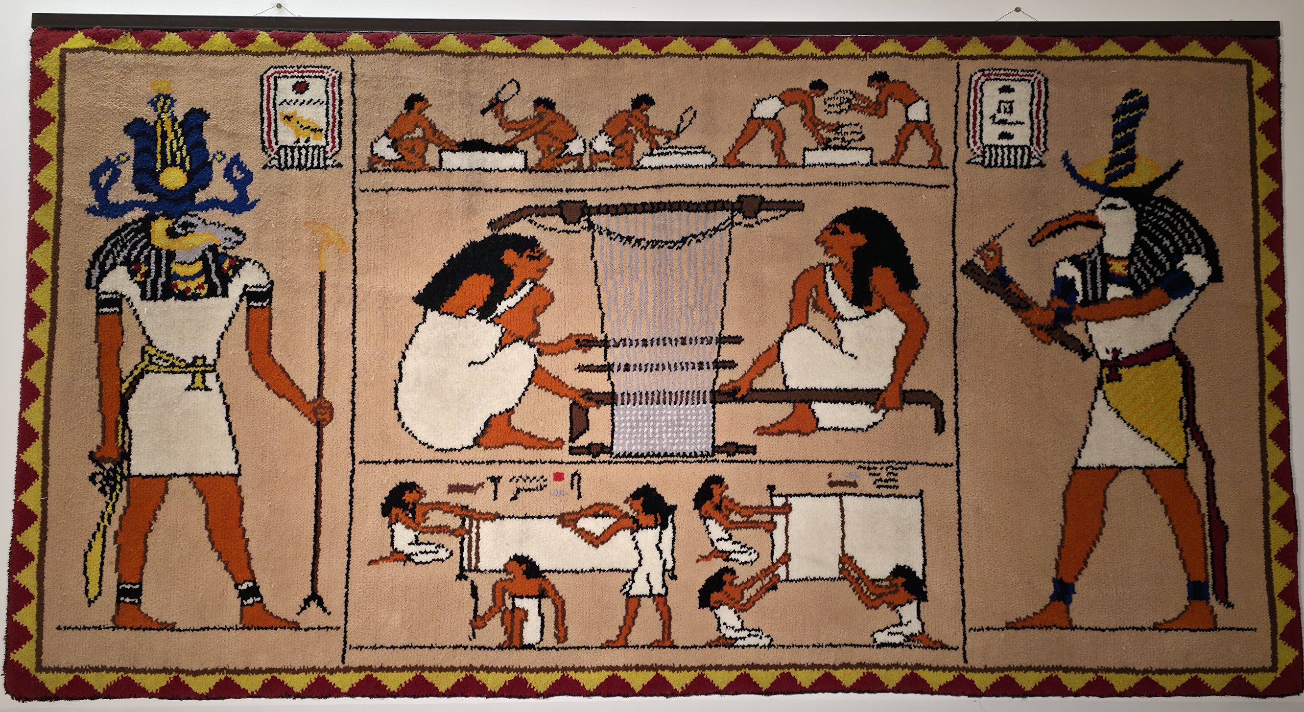 Jednotlivé egyptské motivy byly nejprve prosvíceny z knihy na malý rastrovací papír formátu A4. Odtud se každý detail ručně přenášel na velký rastrovací arch. Každý čtvereček malého rastru musel přesně odpovídat čtverečku na velkém rastru. Následovalo ruční vybarvování – opět čtvereček po čtverečku.